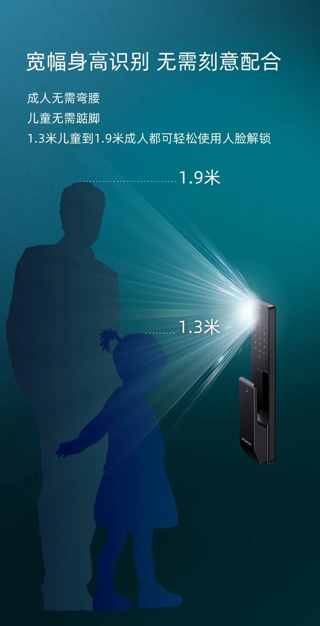 寬幅身高識別+自適應(yīng)環(huán)境光線識別,無需刻意配合。V3f人臉安全云鎖使用超大視角,從1.3米兒童到1.9米成人都可輕松使用人臉解鎖,大人無需彎腰、小孩無需墊腳;采用紅外成像原理,搭配IR泛光燈補(bǔ)光,完成“自適應(yīng)環(huán)境光線識別”的日常使用需求;哪怕環(huán)境是昏暗樓道,有紅外干擾,又或是有高強(qiáng)度陽光,人臉識別依舊高精度、高效、迅速。