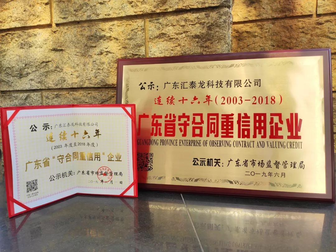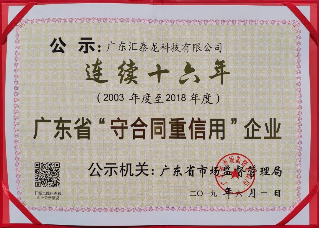 近日,經(jīng)廣東省市場監(jiān)督管理局嚴(yán)格審核并予公示,廣東匯泰龍科技有限公司(現(xiàn)已更名為“廣東匯泰龍科技股份有限公司”)被授予“連續(xù)十六年(2003-2018)廣東省守合同重信用企業(yè)”榮譽(yù)稱號(hào)。