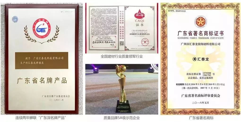 誠信經(jīng)營,榮譽(yù)見證。23年來,匯泰龍因?yàn)槭睾贤匦庞?,得到眾多?quán)威機(jī)構(gòu)的認(rèn)可,榮獲“中國質(zhì)量服務(wù)信譽(yù)AAA企業(yè)”、“全國建材行業(yè)質(zhì)量領(lǐng)軍企業(yè)”、“全國家居業(yè)“質(zhì)量品牌5A級(jí)示范企業(yè)”、“全國產(chǎn)品和服務(wù)質(zhì)量誠信示范企業(yè)”等榮譽(yù)稱號(hào)。