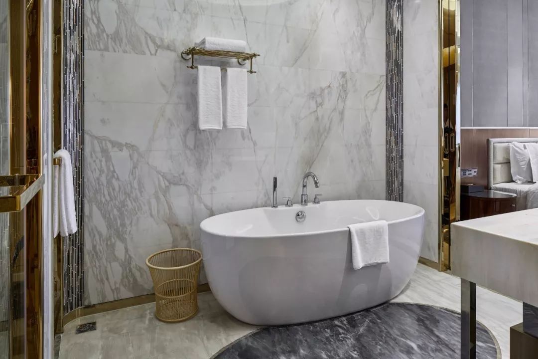 蜂巢酒店的浴室里,大理石搭配锃亮的金屬生活五金,盡顯高端大氣。