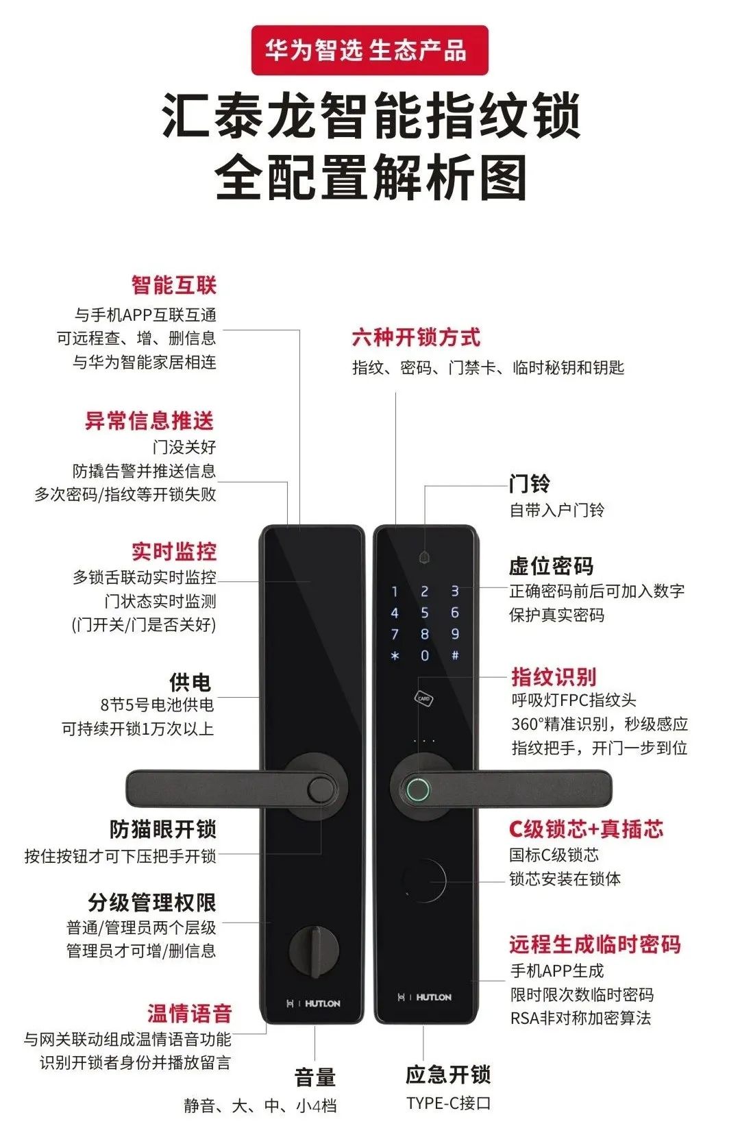華為智選生態(tài)產品 匯泰龍智能指紋鎖,由匯泰龍與華為智選雙方深度合作共同設計打造而成。匯聚匯泰龍二十余年的鎖具經驗,結合華為“芯、端、云”等多方面的技術。