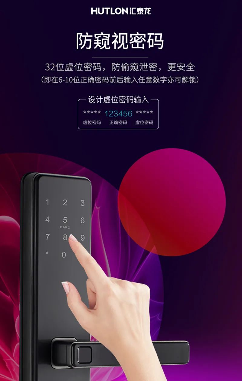 虛位密碼技術(shù),是密碼開(kāi)鎖中的一種。匯泰龍智能鎖支持的虛位密碼,我們可以在連續(xù)的正確密碼的前后,隨意輸入不規(guī)則數(shù)字,只要中間有連續(xù)正確的密碼就可開(kāi)門(mén),掩蓋真實(shí)密碼,做到防窺視。