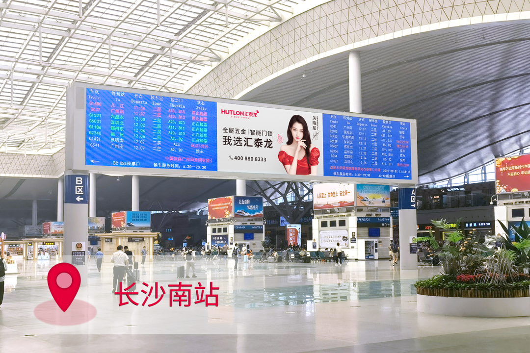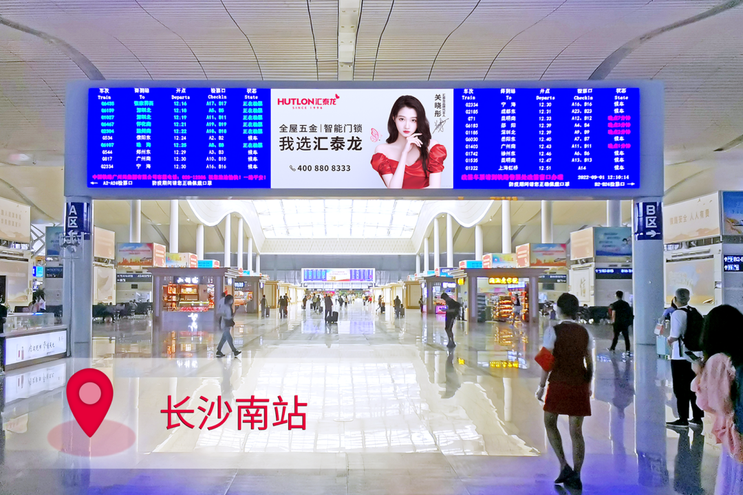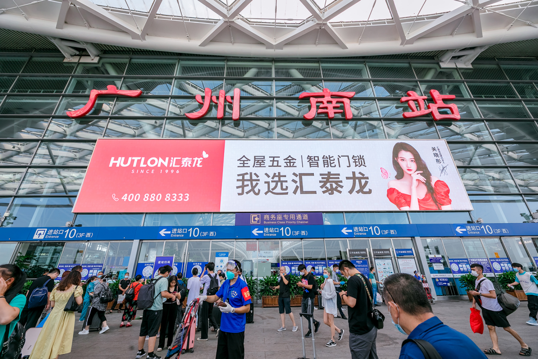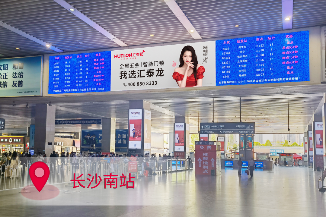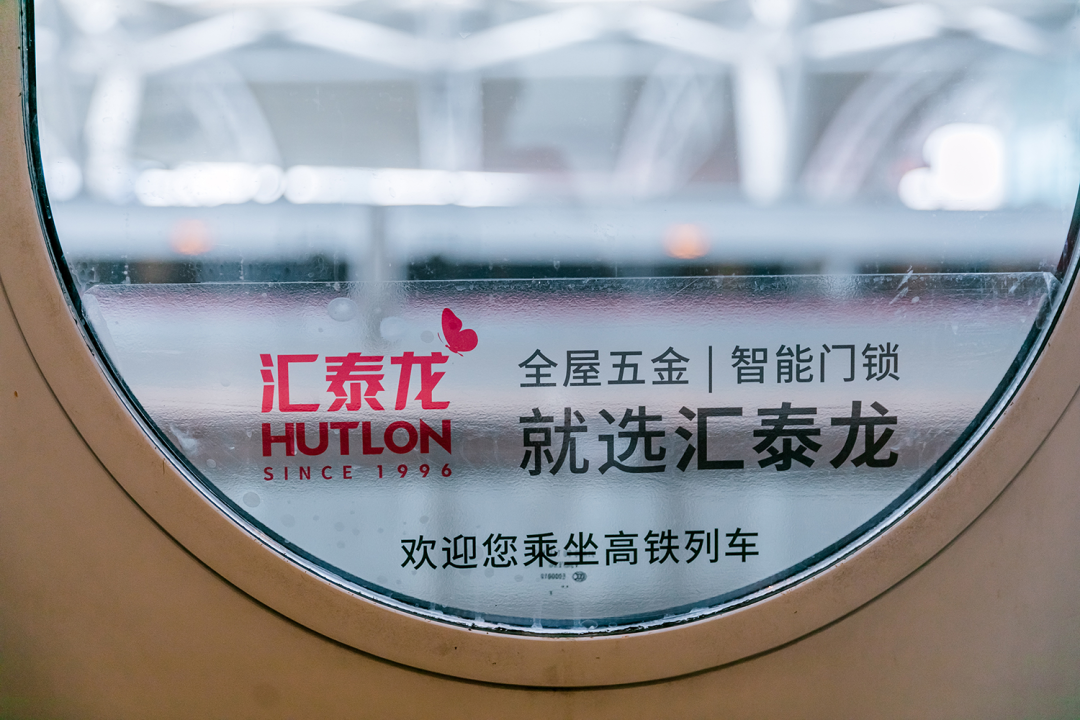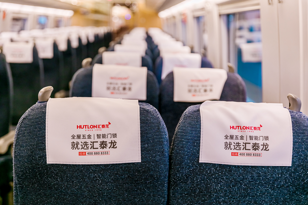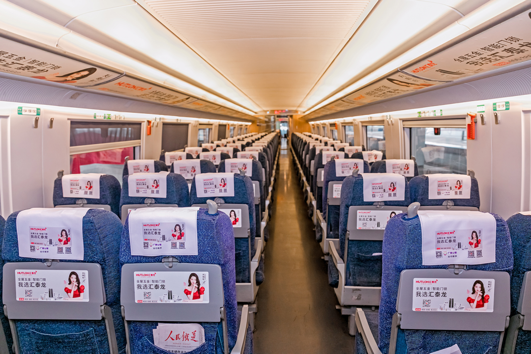 在站臺(tái),作為“第一眼印象媒體”和乘客上下車必看媒體,外車身貼匯聚了站內(nèi)旅客極大的關(guān)注度。匯泰龍冠名高鐵列車,整車8節(jié)車廂兩側(cè),均印有匯泰龍logo+“全屋五金丨智能門鎖”,沿途城市皆可展現(xiàn),高效傳達(dá)品牌形象,強(qiáng)化記憶。