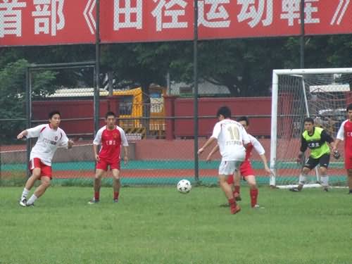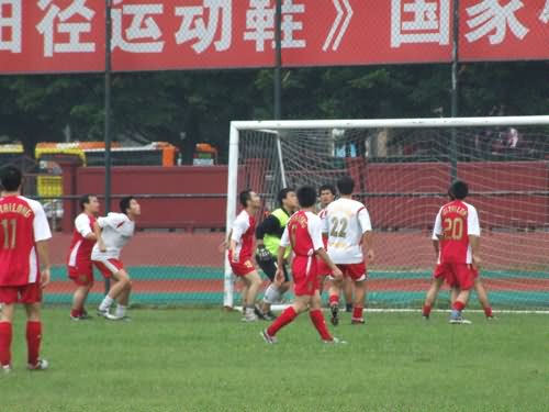 下午4:30球賽正式開始,兩隊(duì)立即展開了激烈的交鋒。只見匯泰龍隊(duì)隊(duì)員帶著球奮勇直闖,成功突破對(duì)方的防守,率先把球射進(jìn)對(duì)方球門。廣東元老隊(duì)也不甘落后,向匯泰龍隊(duì)發(fā)起了猛烈的進(jìn)攻,比賽開始30分鐘后,一腳精彩的射門,贏得了觀眾熱烈的歡呼和掌聲。