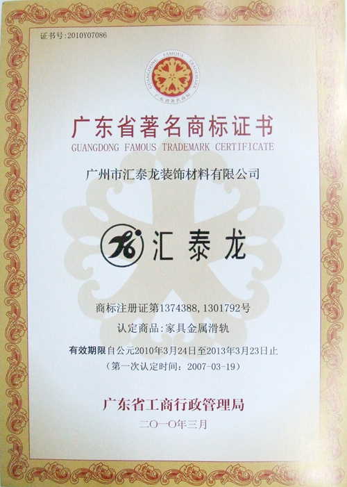 根據(jù)《廣東省著名商標(biāo)認(rèn)定和管理規(guī)定》和《廣東省工商行政管理局關(guān)于廣東省著名商標(biāo)認(rèn)定和管理的實施細(xì)則》的規(guī)定,經(jīng)廣東著名商標(biāo)評審委員會評審?fù)ㄟ^,繼2006年首次認(rèn)定后,2010年3月,廣東省工商行政管理局再次認(rèn)定“匯泰龍”商標(biāo)為廣東省著名商標(biāo)。