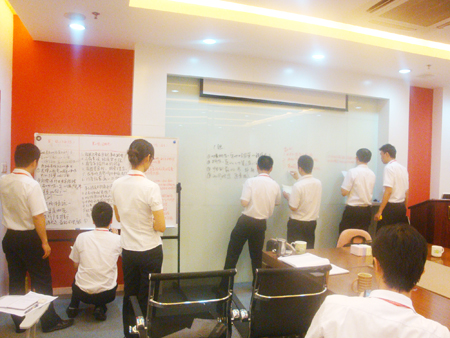 培訓課上,全體學員被分為三個學習小組,針對“目前經(jīng)銷商營銷管理遇到的常見問題”、“經(jīng)銷商營銷管理的方法”、“提高經(jīng)銷商營銷管理的途徑”等主題展開討論,并由組長把學員的討論結果公布出來。學員們積極討論,踴躍發(fā)言,寫滿了整整一個黑板。在這些觀點中,顯現(xiàn)出了許多優(yōu)秀的營銷觀點,有的觀點從人才引進和人才管理方面出發(fā),有的觀點從市場開拓方面出發(fā),還有的從品牌推廣等等方面出發(fā)提出了具體的措施和方法。徐副總發(fā)動全體學員針對每一小組提出的方案一一評定,對方案的可執(zhí)行性和合理性作了詳細的分析。在這次頭腦風暴式的培訓課程中,大家暢所欲言,在提高經(jīng)銷商營銷管理能力水平方面收獲頗豐。
