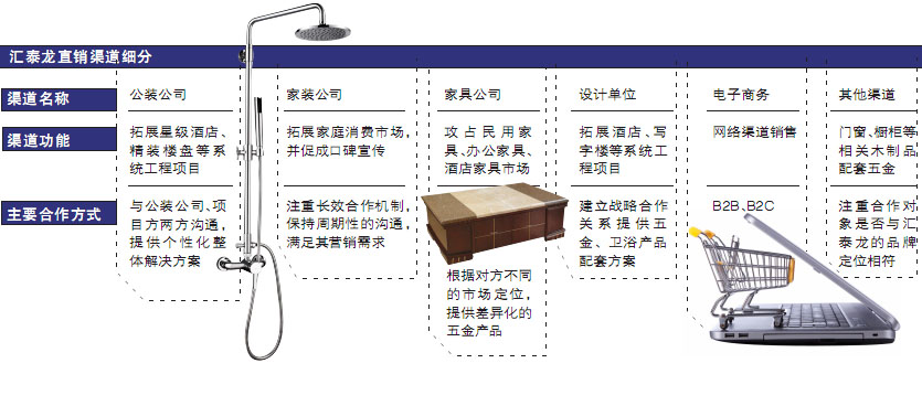 裝飾五金舊有的營(yíng)銷(xiāo)渠道一般是比較簡(jiǎn)單,建材市場(chǎng)、家具市場(chǎng)、五金店是傳統(tǒng)的銷(xiāo)售渠道。匯泰龍換了一個(gè)角度來(lái)思考,從產(chǎn)品的消費(fèi)對(duì)象出發(fā),進(jìn)行創(chuàng)新性的拓展并細(xì)分渠道。比如公裝公司、家裝公司、家具公司……都在匯泰龍細(xì)分的營(yíng)銷(xiāo)渠道之列。除了產(chǎn)品的微創(chuàng)新,匯泰龍?jiān)谇赖募?xì)分上的微創(chuàng)新天賦也在彰顯。