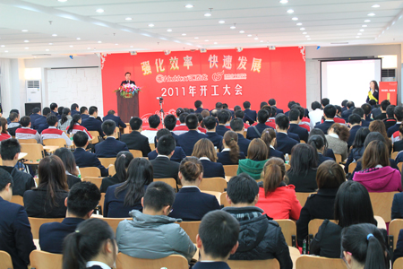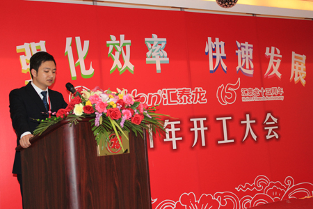 6點半,開工大會準時開始,董事長陳鴻填先生首先向公司全體員工及員工家人朋友表達了新年祝福!接著,陳董以“新起點,新目標”為主題,和大家共同回顧過去一年全公司所取得的成績,共同檢討過去一年中的不足,闡述公司未來三年的主要發(fā)展規(guī)劃和思路。董事長最后對2011年主題文化——效率年作了詳細的的詮釋,自此匯泰龍進入“強化效率,快速發(fā)展”的效率年。