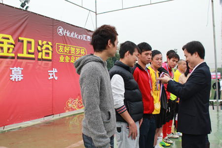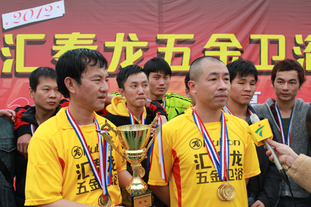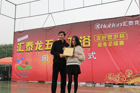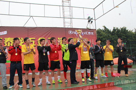 13點30分,四支球隊及其拉拉隊員、匯泰龍公司足球隊代表陸續(xù)到達比賽現(xiàn)場,隨著哨聲響起,激烈的爭奪比賽開始,四個球隊的隊員在場上奮力拼殺,各個隊員之間通力配合,場下的啦啦隊吶喊聲、加油聲不斷,雖然天氣比較寒冷,但球場上和球場下的氛圍非常的熱烈。經(jīng)過一番激烈的比賽,最終決勝出冠軍隊潮汕聯(lián)隊、亞軍隊:汕頭棉湖、季軍隊:西利村。隨即舉行了精彩的閉幕式,匯泰龍董事長陳鴻填先生、前廣東省體育局局長、前足球協(xié)會體育局局長董良田先生、前中國國家隊隊長池明華先生、廣東省體育局黨組成員、監(jiān)察專員、廣東省足協(xié)副主任,原省委老干局局長蔡偉雄先生分別為冠、亞、季軍頒發(fā)獎牌和獎杯。本次比賽還評選出最佳領(lǐng)隊獎、最佳射手獎、最友好球隊等多項獎項。