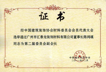 正因?yàn)槿绱?,中國建筑裝飾界最權(quán)威的組織——中國建筑裝飾協(xié)會,于近日欣然授予匯泰龍公司“中國建筑裝飾協(xié)會材料委員會副會長單位”的榮譽(yù),同時(shí)授予匯泰龍董事長陳鴻填先生"第二屆委員會副會長"榮職,這也是繼2011年全國裝飾材料工作會議上董事長榮獲“優(yōu)秀企業(yè)家”、公司榮獲“全國裝飾材料行業(yè)優(yōu)秀企業(yè)”后的又一殊榮。