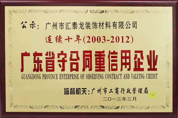 匯泰龍公司自成立以來,嚴格遵守《中華人民共和國合同法》和公司關于合同管理的相關規(guī)定、強化合同管理機制、加強公司合同信用建設。經(jīng)過十七年的發(fā)展,匯泰龍人深刻理解“人無信不立,企無信不興”這一信條,并以“品質造就滿意”作為經(jīng)營理念深深的把“誠信”植根于每一個匯泰龍人的心中,把“誠信”貫徹到日常工作的方方面面。“廣東省守合同重信用企業(yè)”榮譽稱號是誠信企業(yè)的金字招牌,是對企業(yè)信用的最權威評定。誠信是企業(yè)發(fā)展的興業(yè)之本,更是企業(yè)塑造品牌的立足之本。匯泰龍把“守合同重信用”作為打造成社會誠信的標榜,積極做好誠信體系建設,為打造“誠信廣州”和促進中國裝飾材料行業(yè)市場又好又快發(fā)展做出新的更大的貢獻。
