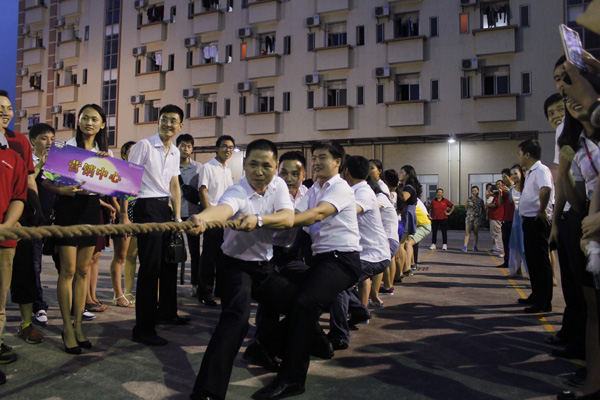 每年的中秋活動(dòng),拔河項(xiàng)目都會(huì)成為整場活動(dòng)的焦點(diǎn)。全公司以中心為單位,被分為八支隊(duì)伍。哨聲一響,男女隊(duì)員就位,大家挽起衣服袖子,憋紅了臉,在紅頭繩的左右搖擺中,加油聲一浪高過一浪。在拔河比賽過程中,也出現(xiàn)了一些啼笑皆非的“笑料”:有人衣服都扯亂了,有人鞋子掉了,還有人累得一屁股坐在了水泥地上。叫喊聲、加油聲、歡笑聲布滿了整個(gè)活動(dòng)現(xiàn)場。最終,制造中心憑借雄厚實(shí)力,輕而易舉把冠、亞軍收入囊中,人事行政中心攬得季軍。