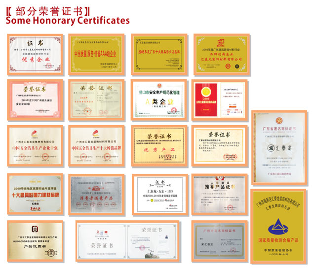 匯泰龍通過ISO9001國際質(zhì)量體系認(rèn)證;成立至今,匯泰龍先后榮獲“廣州市著名商標(biāo)”、“廣東省著名商標(biāo)”、“中國質(zhì)量服務(wù)信譽(yù)AAA級(jí)企業(yè)”、“廣東省優(yōu)秀自主品牌”等200多項(xiàng)國家、省市級(jí)榮譽(yù)和認(rèn)證。