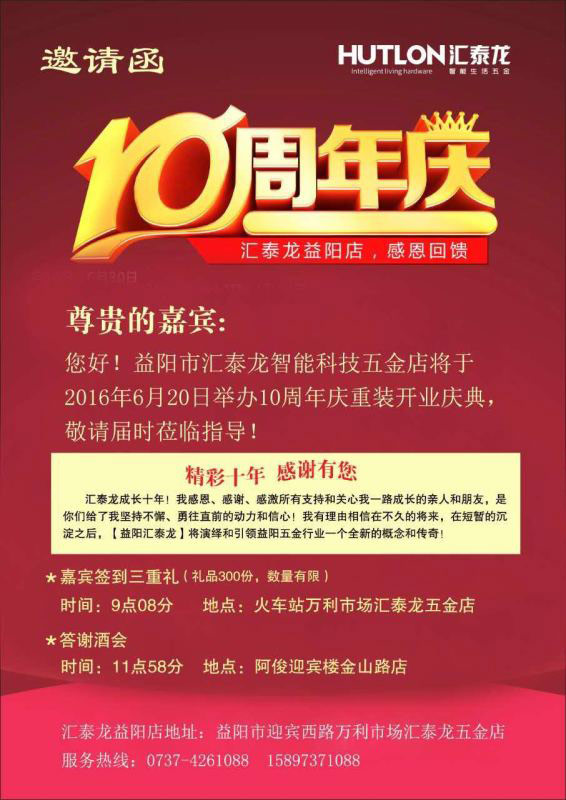 夏至將至,標志著夏天的來臨。夏日驕陽似火,不少地方已經(jīng)開啟高溫模式。6月20日,在你享受著空調(diào)的清涼的時候,匯泰龍智能生活五金益陽萬利專賣店與太陽肩并肩,在一片歡聲中重裝開業(yè)!不僅有豐富禮品等你來拿,還有答謝酒會等你來約! 匯泰龍經(jīng)歷了無數(shù)的風風雨雨,取得了眾多的榮譽,它的產(chǎn)品精雕細琢,精益求精,值得信賴!匯泰龍智能生活五金益陽萬利專賣店為您帶來高質(zhì)量的五金建材產(chǎn)品,門鎖五金、裝飾五金、家具拉手、衛(wèi)浴掛件……每一個產(chǎn)品,每一個細節(jié)都完美無瑕,讓人放心! 10周年慶重裝開業(yè)! 好禮相送,好酒相待! ——匯泰龍智能鎖系統(tǒng)—— 高科技產(chǎn)品,高端大氣,安全便捷! ——匯泰龍門鎖五金系列—— 無論現(xiàn)代古典、歐式中式,這里全都有! ——匯泰龍衛(wèi)浴掛件系列—— 古典的味道,讓你感受藝術的氣息! ——匯泰龍家具五金、裝飾五金系列—— 品類繁多,應用盡有,歡迎選購! ——匯泰龍家具拉手系列—— 品質(zhì)上乘,安全耐用,值得你信賴! 匯泰龍一如既往,用最好的產(chǎn)品回饋顧客,用最好的服務,讓顧客滿意。匯泰龍智能生活五金益陽萬利專賣店將秉承“匠心智造,永恒品質(zhì)”的企業(yè)理念,以周全、貼心的服務態(tài)度和國際化的質(zhì)量,為您提供智能生活五金全系統(tǒng)解決方案! 專賣店檔案 店名:匯泰龍智能生活五金益陽萬利專賣店 店長:譚先生 手機:158 9737 1088 電話:0737-4261088 地址:湖南省益陽市迎賓西路萬利市場匯泰龍五金店