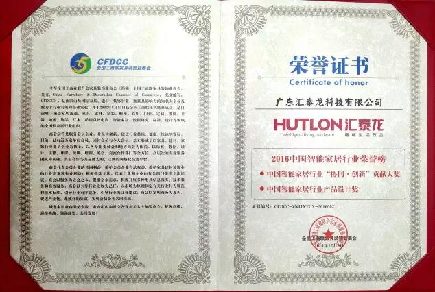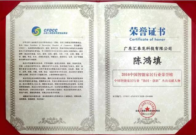 在接下來(lái)的2016中國(guó)家居業(yè)優(yōu)秀品牌表彰大會(huì)上,匯泰龍公司榮獲中國(guó)智能家居行業(yè)“協(xié)同·創(chuàng)新”貢獻(xiàn)大獎(jiǎng)、中國(guó)智能家居行業(yè)產(chǎn)品設(shè)計(jì)大獎(jiǎng);陳鴻填先生榮獲中國(guó)智能家居行業(yè)“協(xié)同·創(chuàng)新”杰出貢獻(xiàn)人物榮譽(yù)!