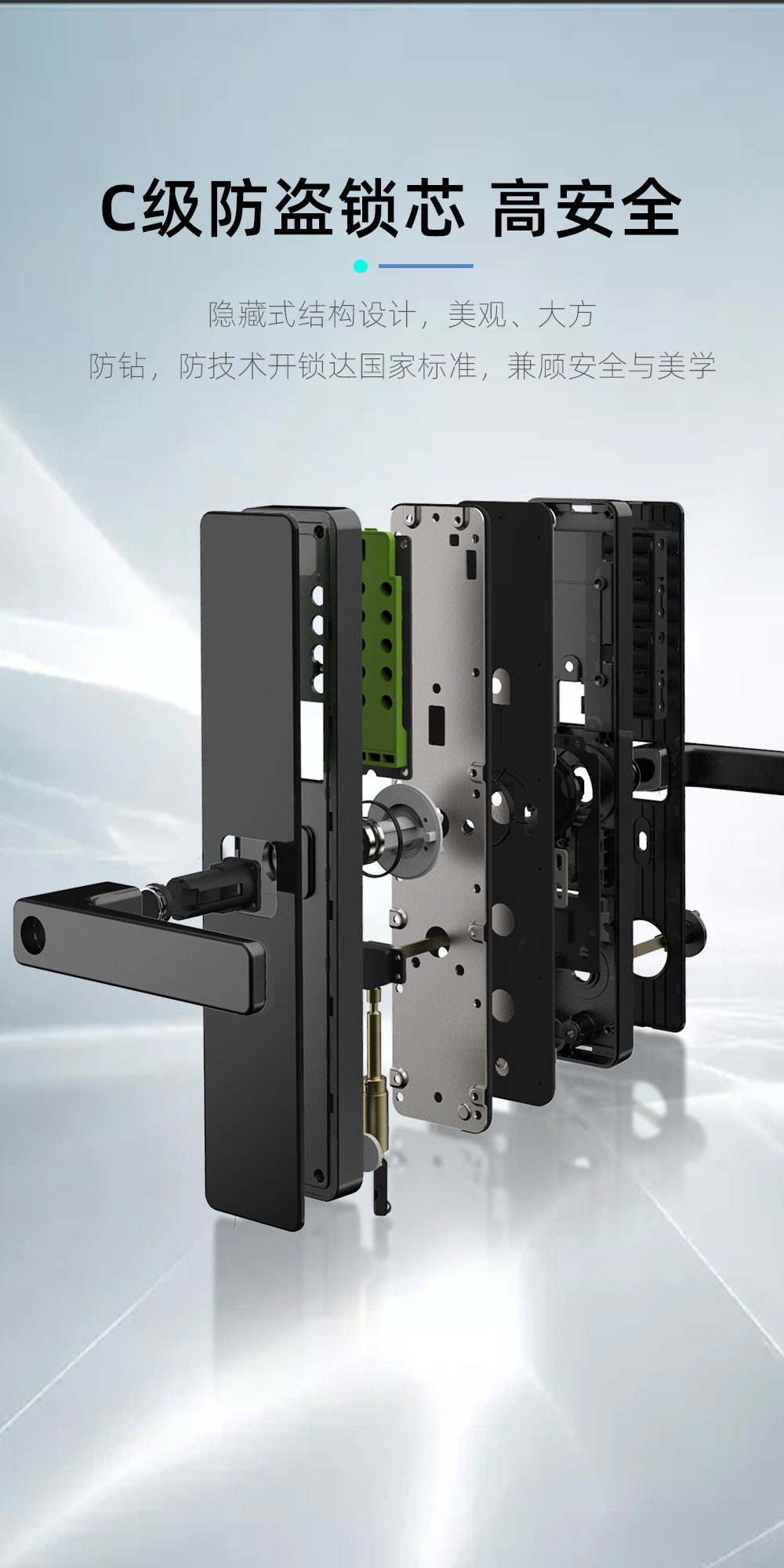 支持指紋、密碼、感應(yīng)卡、機(jī)械鑰匙四合一開(kāi)鎖方式;