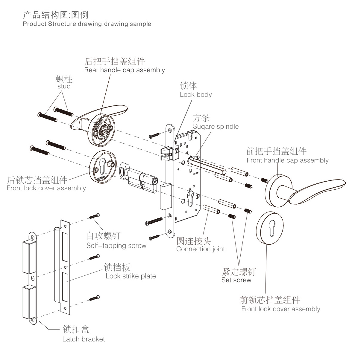 6擰緊螺釘,安裝扣板及扣盒,對齊鎖體,應使鎖舌與之配合順暢,擰緊螺釘(如上圖:H)。
