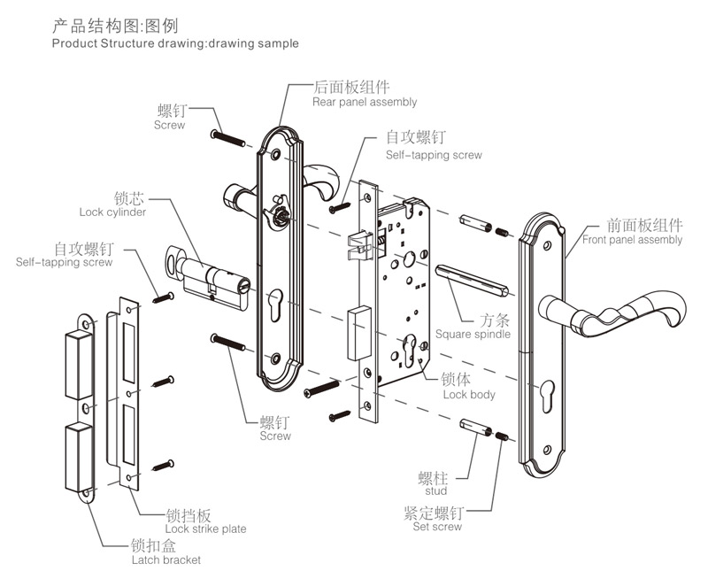 6擰緊螺釘,安裝扣板及扣盒,對齊鎖體,應(yīng)使鎖舌與之配合順暢,擰緊螺釘(如上圖:H)。